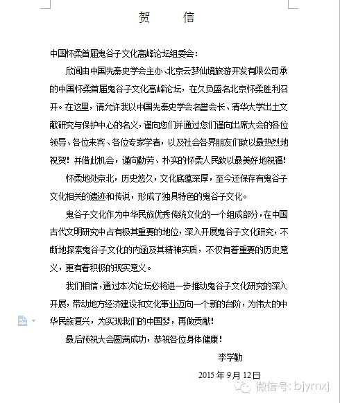 9月12日中国先秦史学会名誉会长李学勤先生曾发来贺信预祝云梦仙境---中国鬼谷子文化高峰论坛会圆满成功!